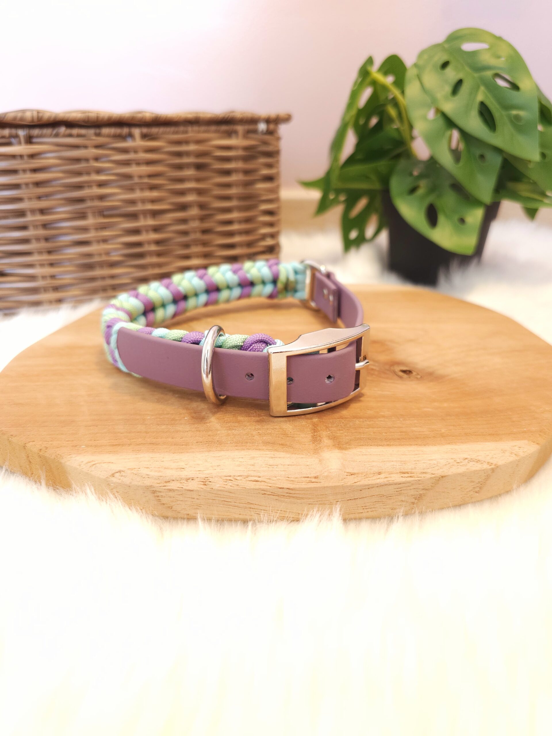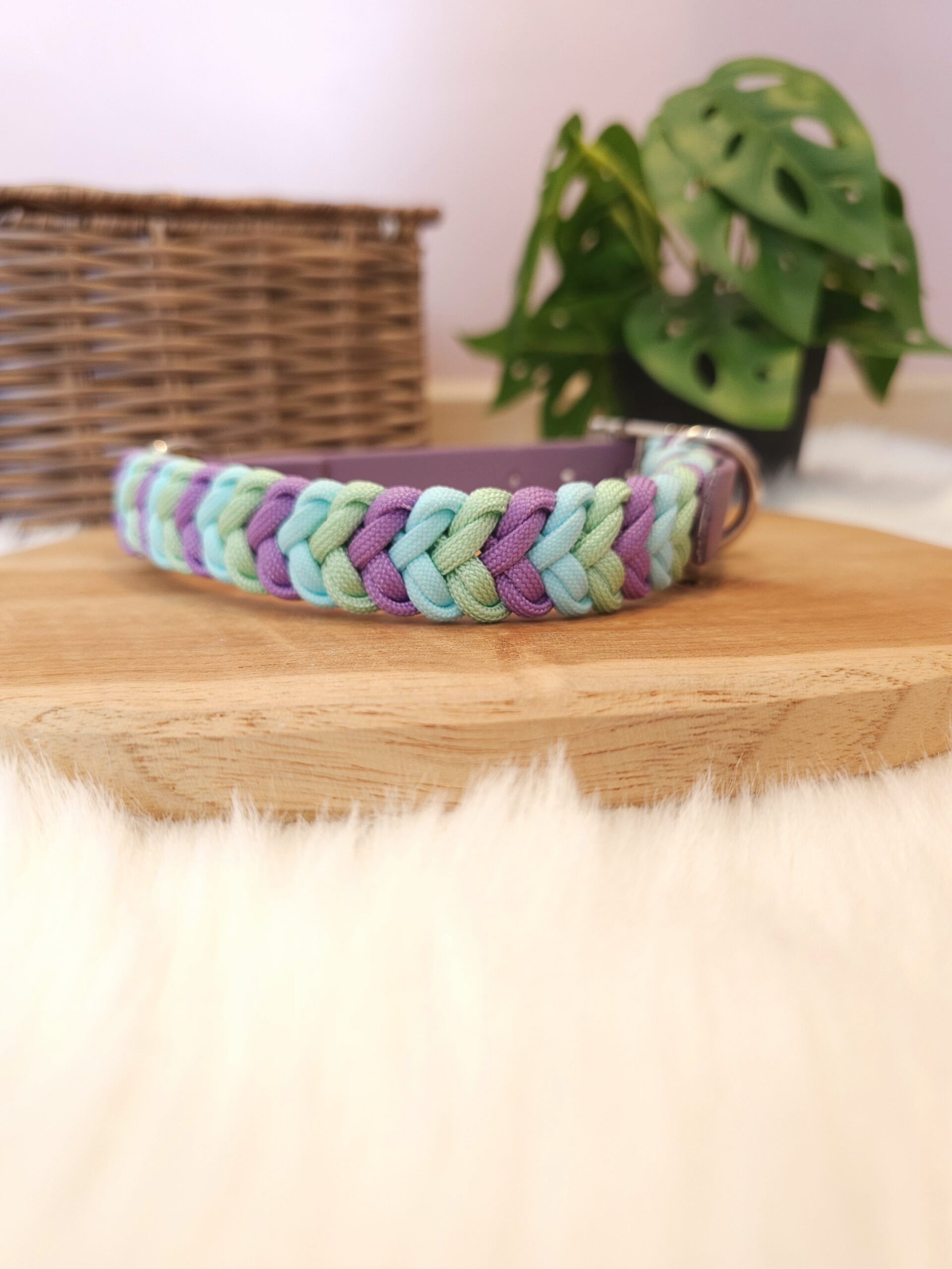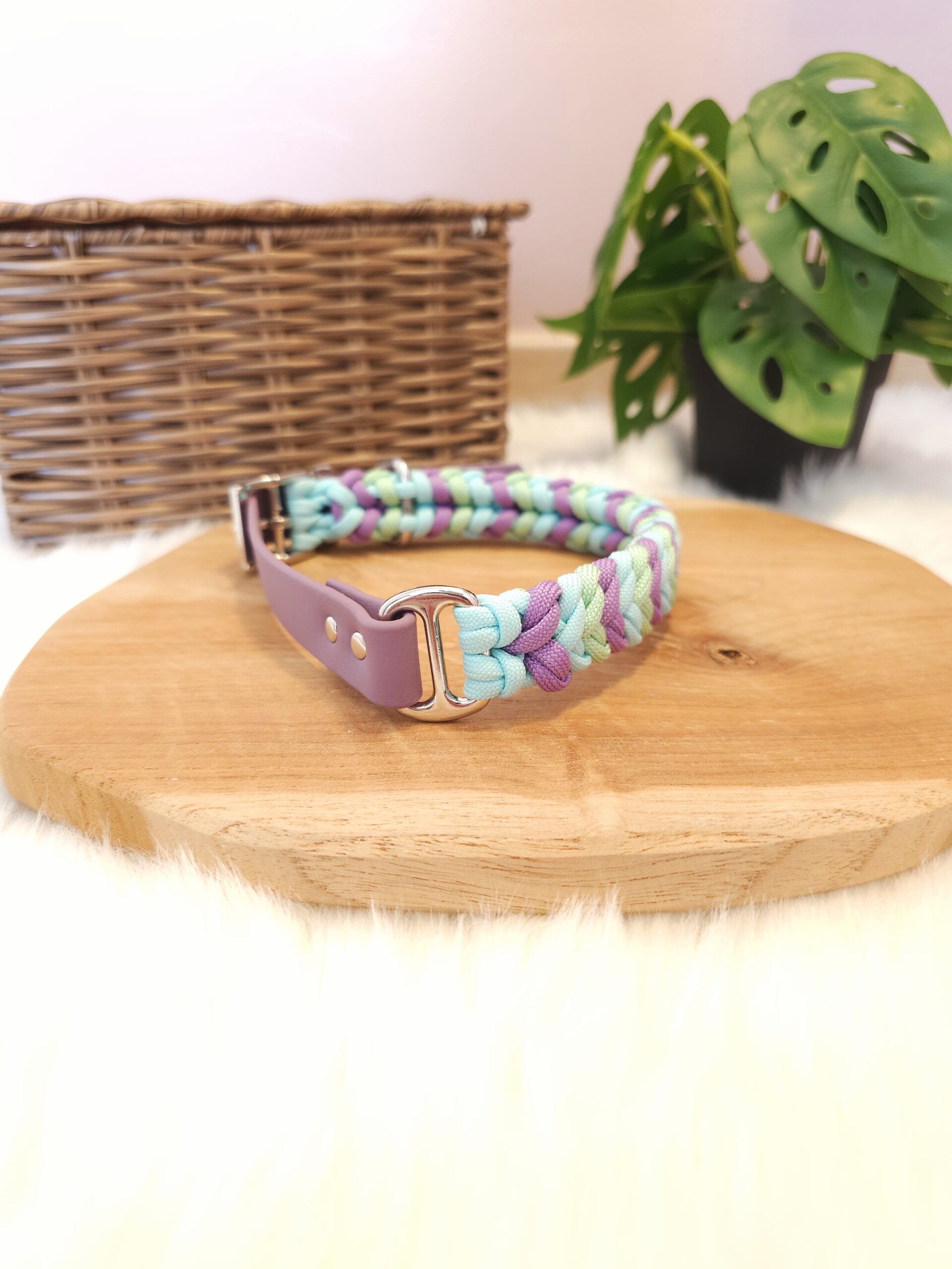 Le biothane purple crée une base tendre et lumineuse. Le tressage mêle un violet, un bleu pastel, et une touche de vert.
