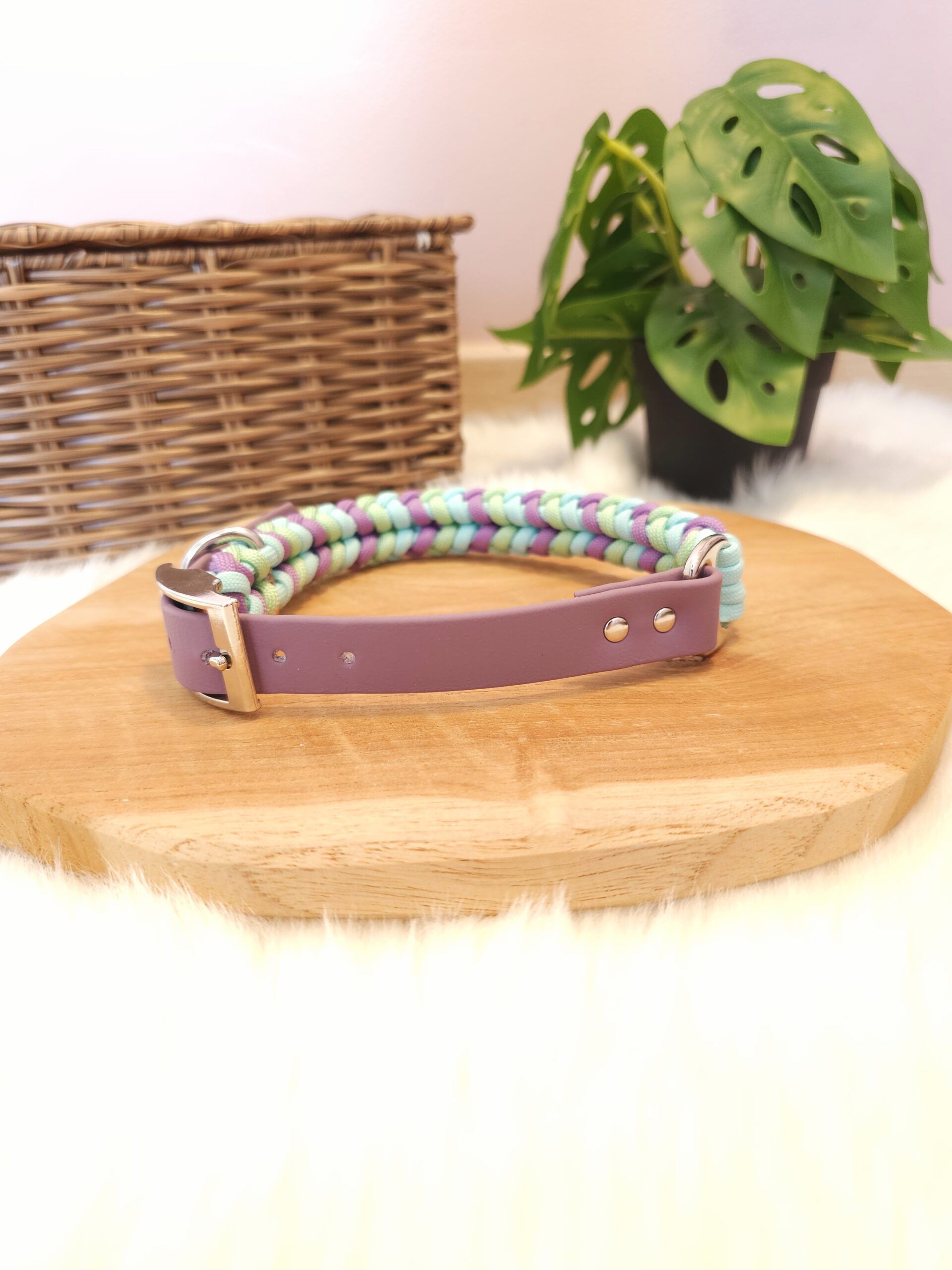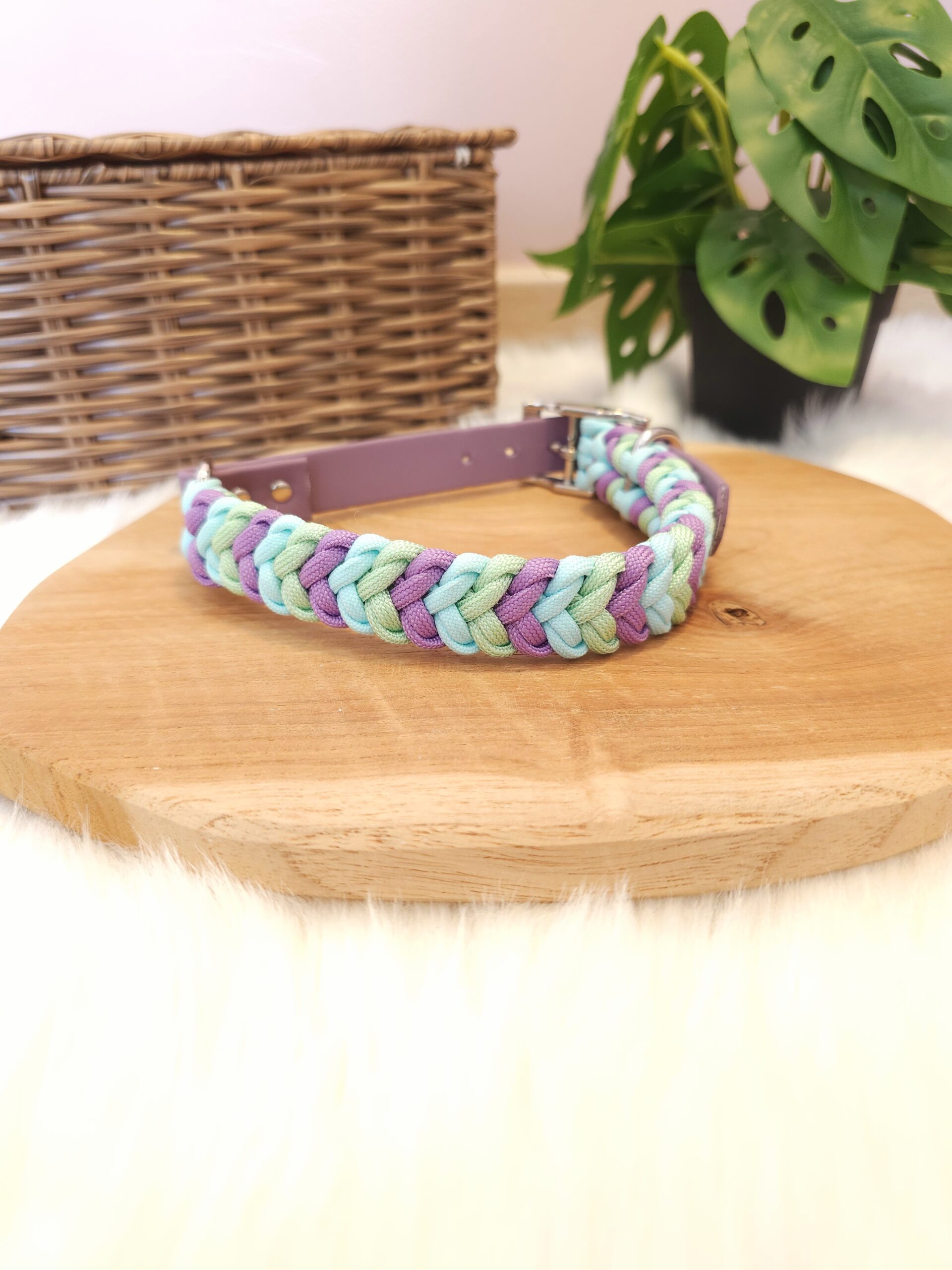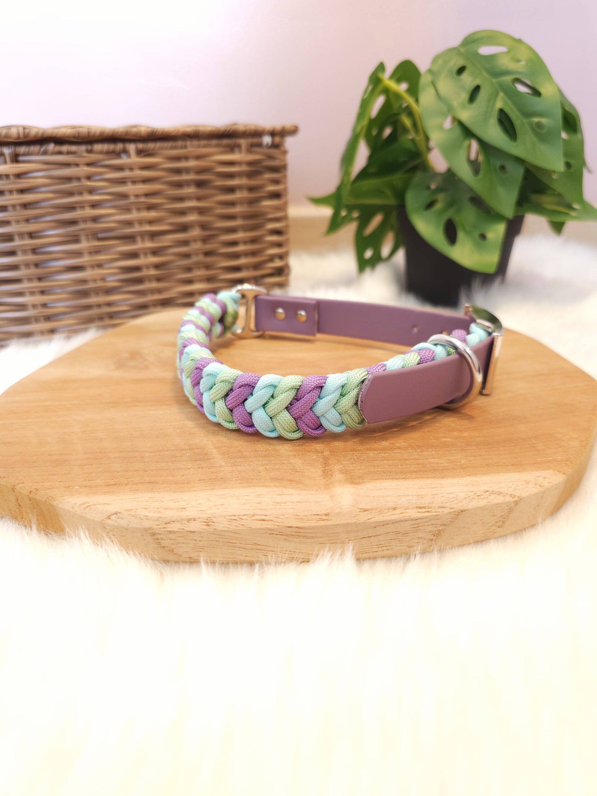 Le biothane purple crée une base tendre et lumineuse. Le tressage mêle un violet, un bleu pastel, et une touche de vert.